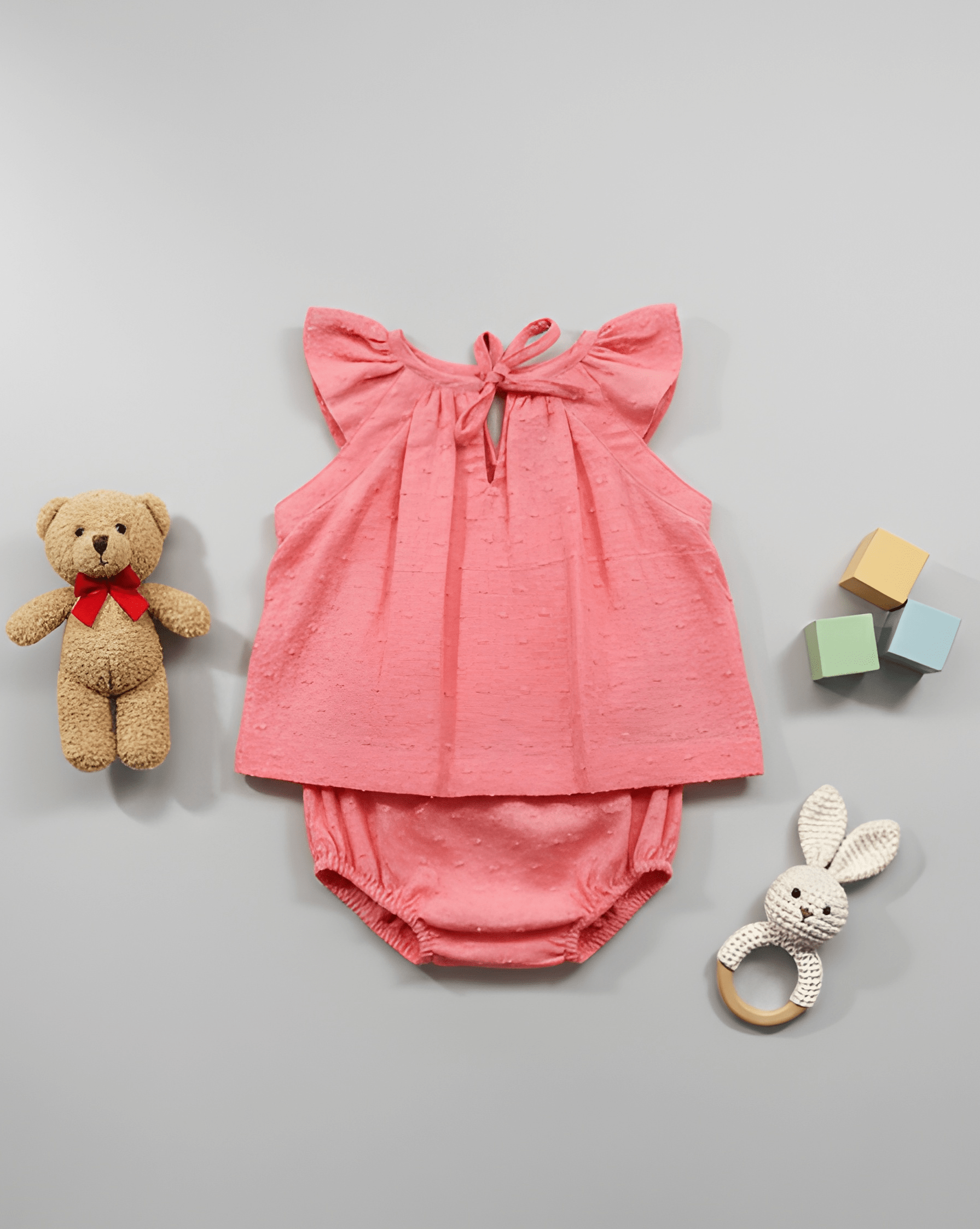 Introduce a touch of sweetness to your little one's wardrobe with our delightful Ruffle-Sleeve Baby Set, now available in two charming colors: Sunshine Yellow and Blush Pink. This adorable two-piece outfit features a soft, breathable top with delicate ruffle sleeves and a gently gathered neckline, paired with comfortable bloomer-style shorts. Both pieces are enhanced with a subtle Swiss dot (or dobby) texture, adding a hint of classic elegance.